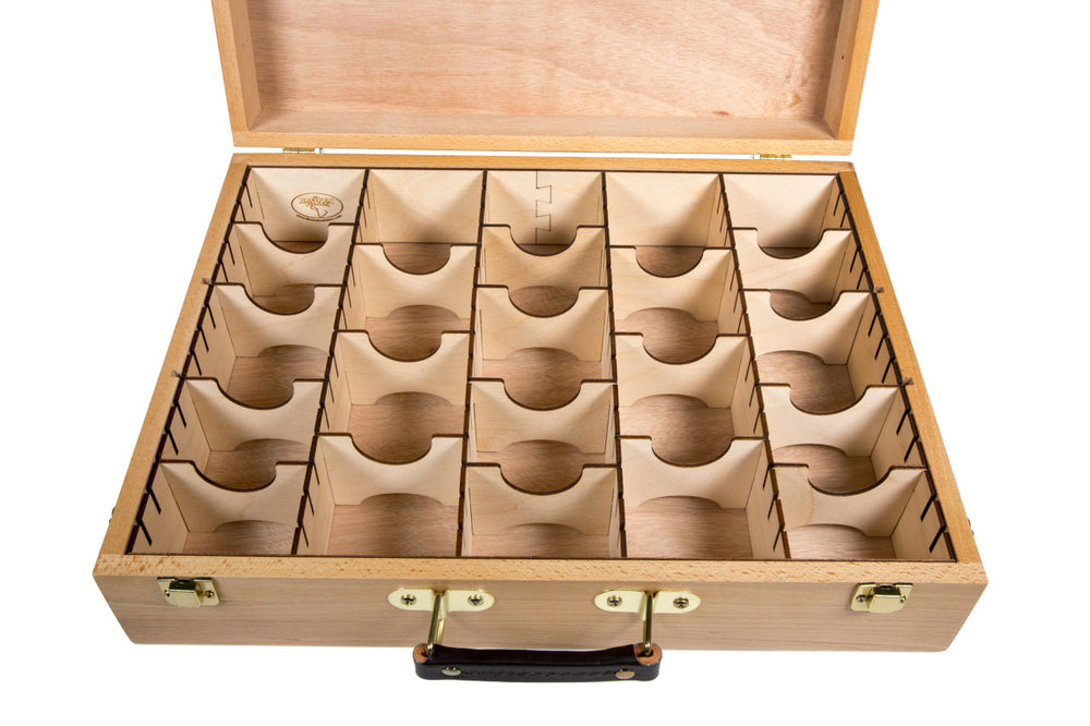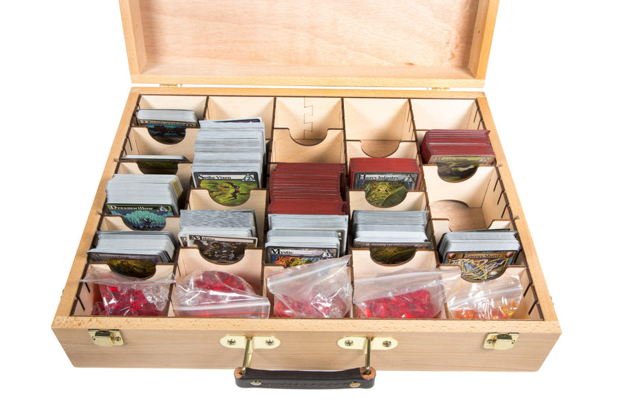 Hobby Lobby All Media Artist's Supply Sketch Box (#125005) installed with an assembled Standard-Sized Card Organizer (ORG141) with 5 rows of card storage and 18 adjustable dividers. We also install dual elastic straps in the lid to hold all of your manuals.