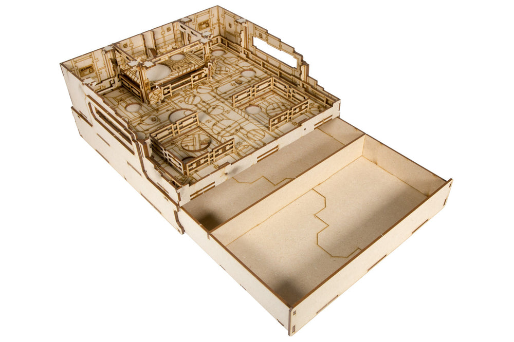 Includes a nested drawer unit with internal divider for storing additional minis, dice, or any other tools or components. Each fully engraved display features a set of two 55mm, five 40mm, and twenty-two 25mm bases cut directly from the stage. (We suggest sanding the edges for a smooth fit). Built-in handles also allow our displays to double as transport trays, letting you carry your forces from battle to battle in unparalleled style.