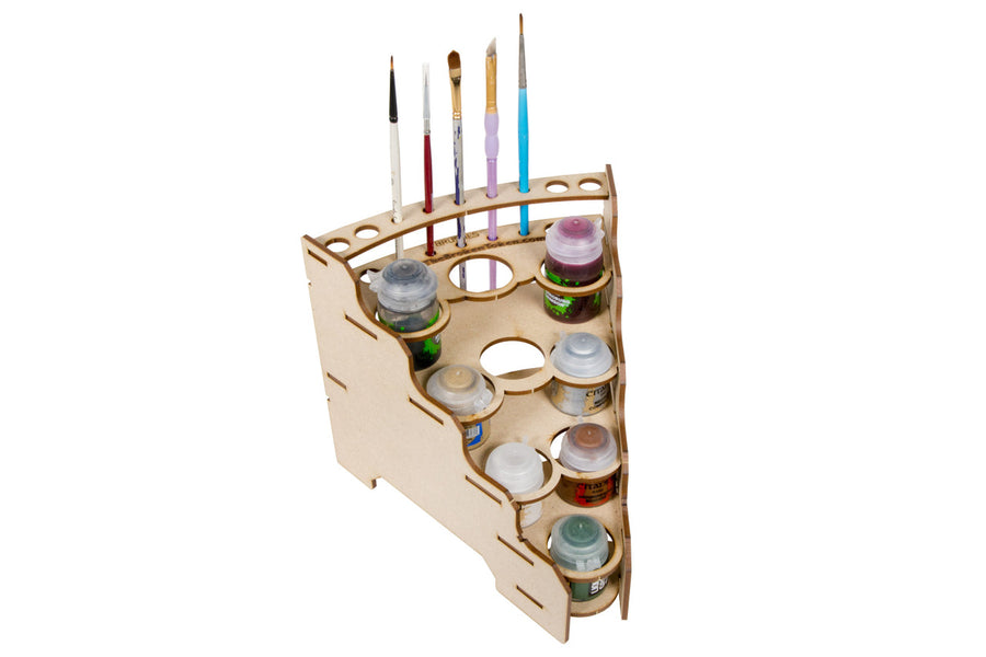 Your miniatures may be works of art, but a disorganized desk certainly isn't. Get your paints and brushes in line with our Modular Paint Rack system! These MDF racks hold your paint pots, bottles and brushes in a tiered layout for easy organization and access when customizing your game pieces. Multiple racks can be combined into a larger system using the included clips!