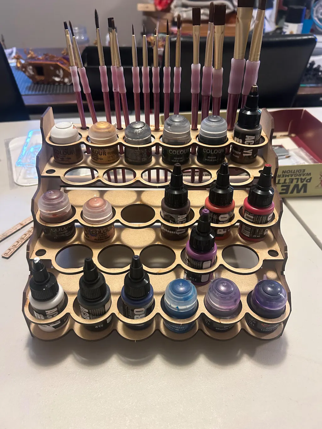 Your miniatures may be works of art, but a disorganized desk certainly isn't. Get your paints and brushes in line with our Modular Paint Rack system!