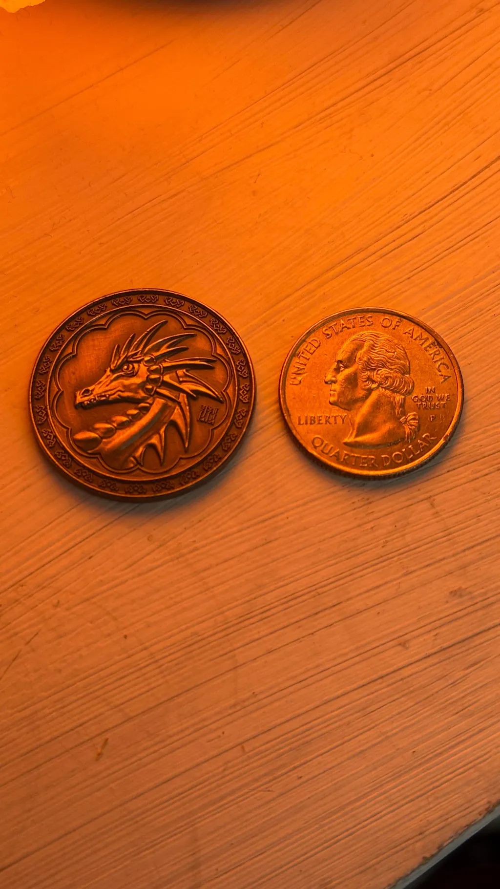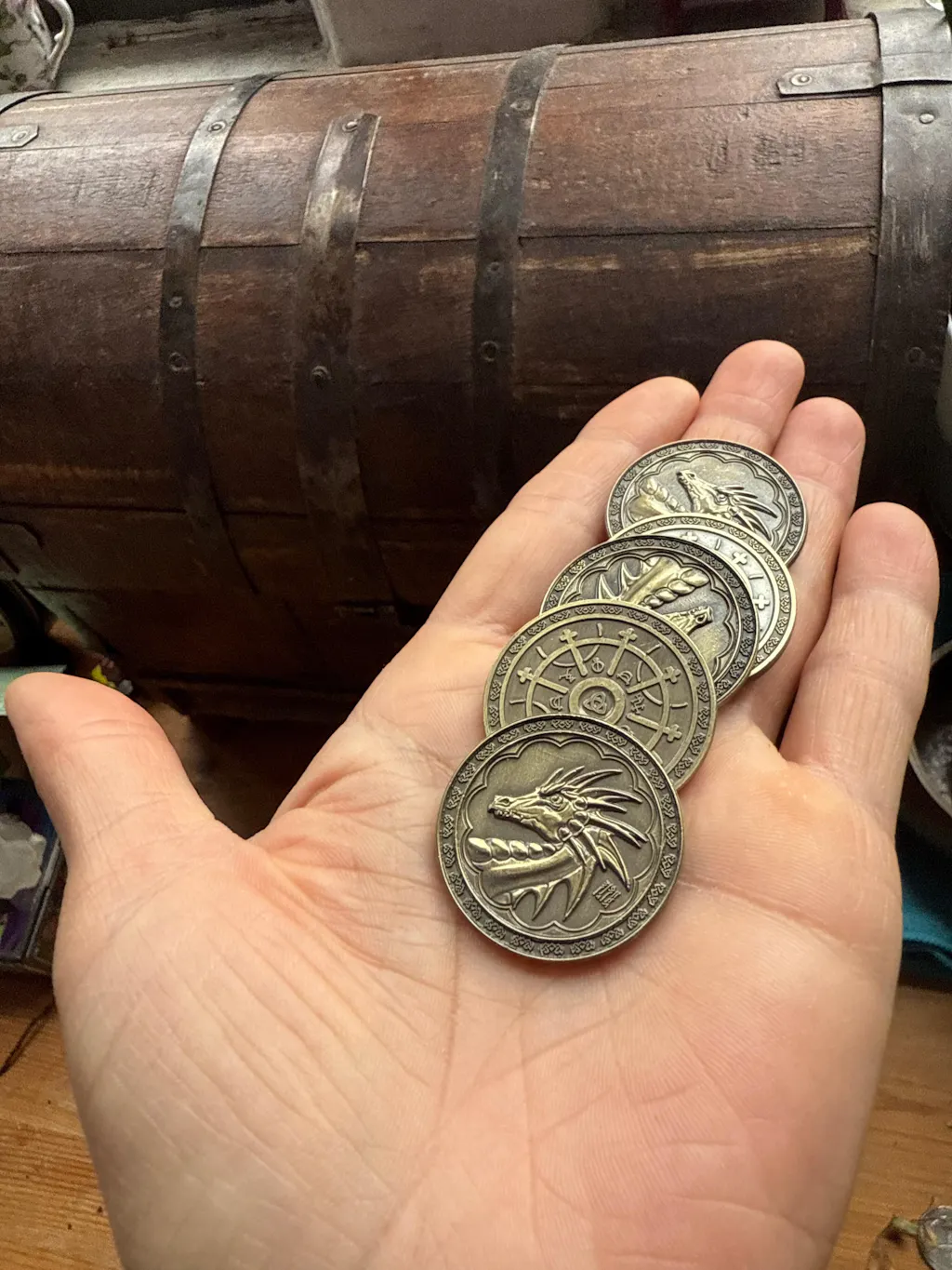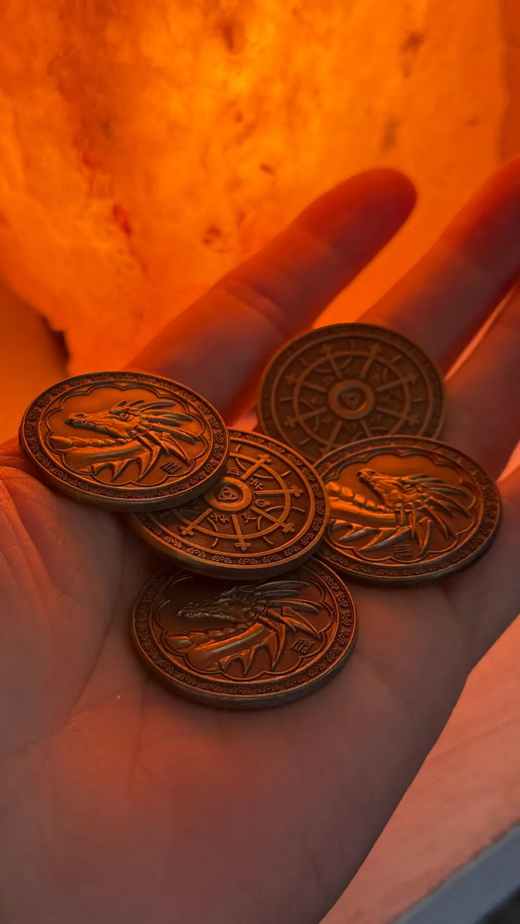 The Magic Gold coins are circle shaped and have an antique gold finish. The art on these coins depicts the head of a dragon on one side, and a Celtic trinity knot with runes on the reverse.