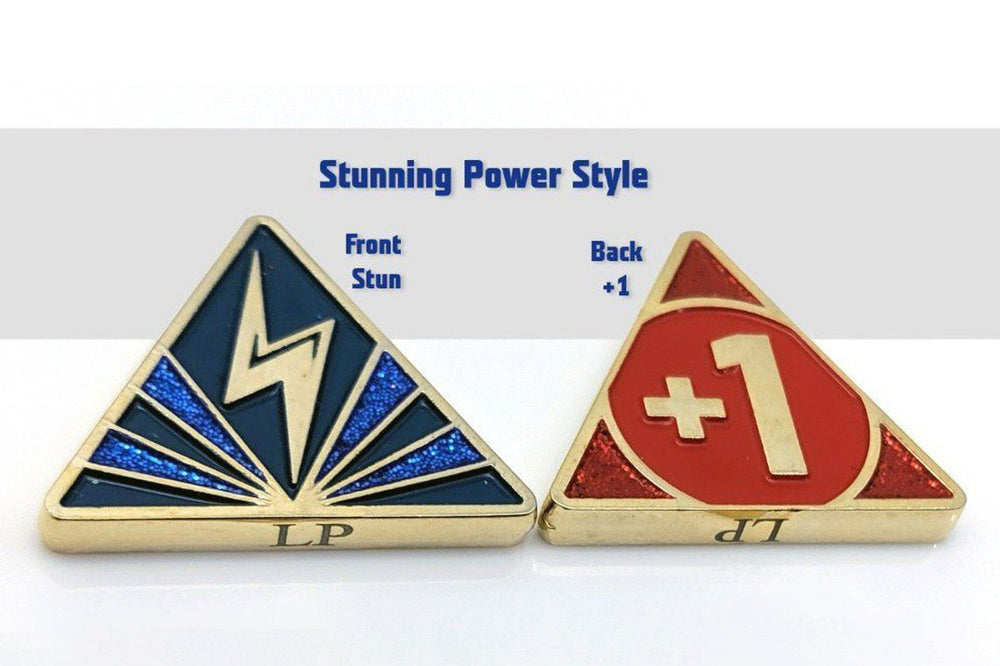 Each token is double-sided. The Stunning Power style token features a stun status bolt on one side, and a '+1' power indicator on the other. The Overpowered style token helps you really crank up the heat witha '+2' on one side and a '+3' on the other.