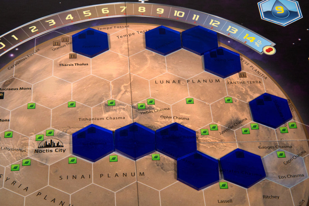 These laser-cut blue acrylic tiles are perfect for bringing a little more life to your game of Terraforming Mars, by Stronghold Games.