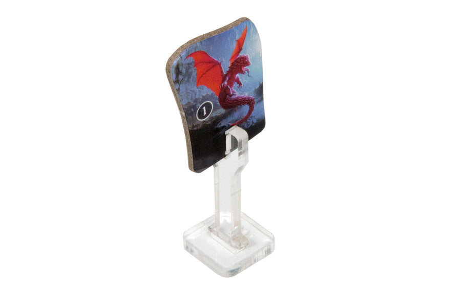Upgrade your token game with these acrylic flying character stands. The clear acrylic stand riser adds to the illusion of flight, rising your flying character pieces above the board. Perfect for the flying drake pieces in Gloomhaven, and cardboard pieces from other games that have a thickness of 2.5mm. Each set comes with 10 stands.Also available with yellow or white bases.