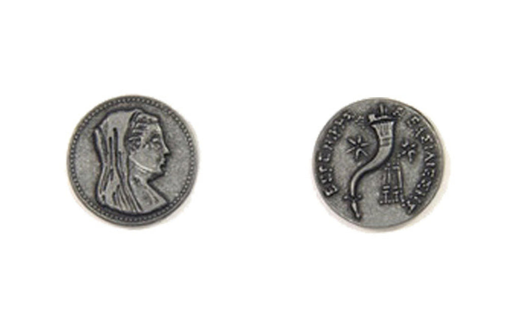 These small Egyptian-themed coins feature Berenice II, queen of Egypt, and a cornucopia on the reverse, with a nickel-tone finish.