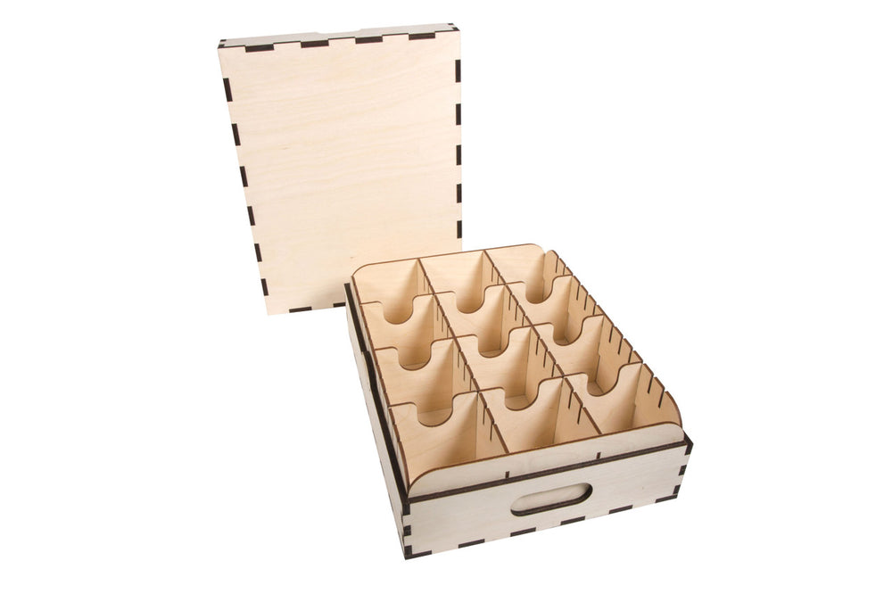 This 3-row case is not engraved. All options have The Broken Token logo engraved on the sides. The card rows are contained in a sturdy 1/4" wooden crate with handle cut-outs on the end. Includes 6 adjustable dividers.