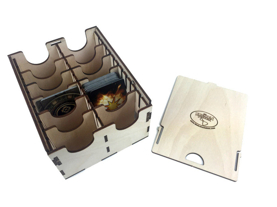 This card case is designed to carry both American and European mini-sized cards such as those used in Star Wars X-Wing. The case includes 8 adjustable dividers and has room for over 400 sleeved cards or 750 unsleeved cards.