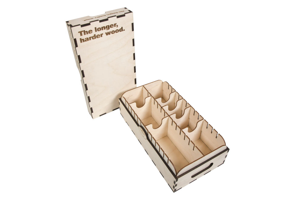 This 2-row case is engraved with "The Longer, Harder Wood." All options have The Broken Token logo engraved on the sides. The card rows are contained in a sturdy 1/4" wooden crate with handle cut-outs on the end. Includes 4 adjustable dividers.