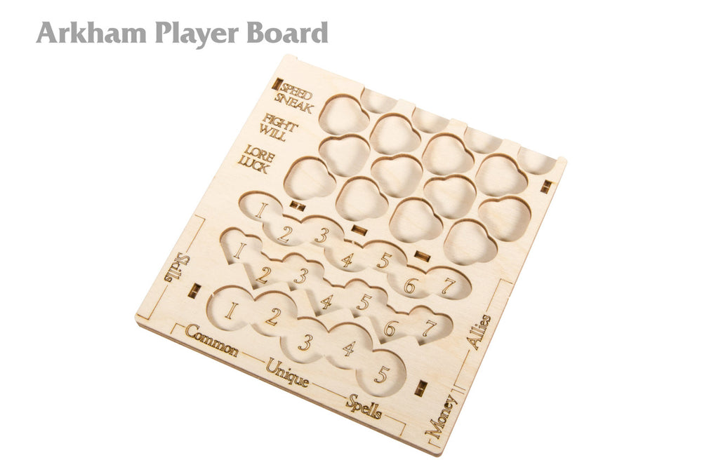 Keep your investigator’s stat markers and assets well organized during gameplay with the Arkham Player Board from The Broken Token.  Up to five of these player boards fit in the Upgrade Tray of the Arkham Altar Crate (GCA020), compatible with the 2nd Edition of Arkham Horror from Fantasy Flight Games..  If you are storing more than five Arkham Player Boards or the Upgrade Tray is storing other upgrades the Investigator’s Journal case featuring thematic engraving stylishly stores up to four Arkham Player Boards vertically.