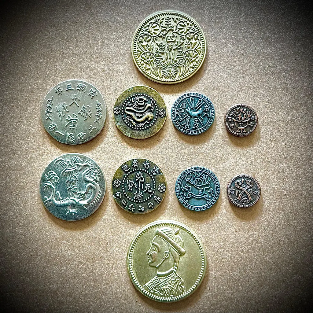 Includes 9 large (30mm) sized coins from the Chinese theme set. Coins are approximately 3mm thick.