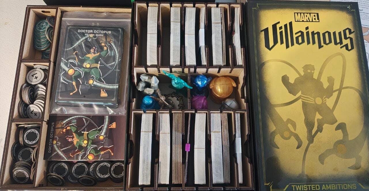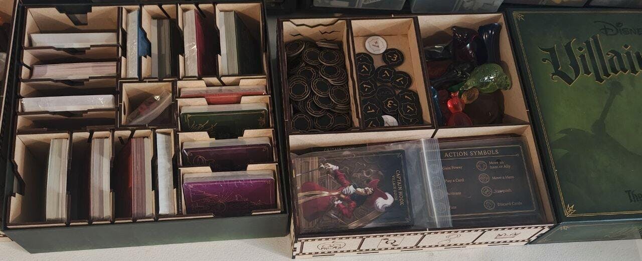 But the other is that the amount of card decks this claims it will hold is not really accurate. I got 8 characters into this setup fairly comfortably. I think if you want to push it you could probably get 10 but after that it's kind of a joke. The reason is some of those card decks are bigger than the others and the slots you would have to put them in are spaced more for that standard size of cards. Not to mention that the plastic Villain mover pieces you play with can be fairly chunky or tall and skinny and they will take up considerable space. My picture shows how my wife and I arranged all 8 of our Marvel characters all into this and you can see it's fairly tight but works. Also worth noting that Villainous throws little extras into the game like a power slider for Titania, some cardboard cards of the Infinity Stones for Thanos, and even extra packs of Fate cards and these type of things all take up extra space you weren't planning on.